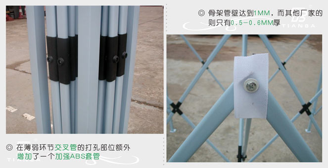 2、廣告帳篷頂布通常印制企業(yè)標(biāo)識(shí)或者廣告語,由于帳篷頂布較平坦不但雨天積水而且廣告效果不佳,長(zhǎng)沙天霸帳篷有限公司特別將帳篷頂加高200MM,從而使帳篷頂布弧度優(yōu)美、外觀流暢、廣告內(nèi)容呈現(xiàn)立體感,廣告效果非常理想。