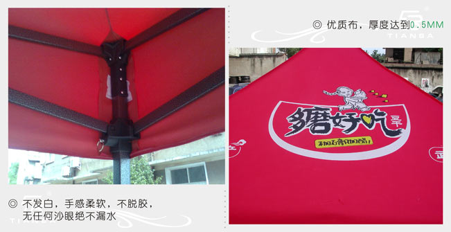 4、廣告帳篷的印刷廣告環(huán)節(jié)特別重要,長(zhǎng)沙天霸帳篷有限公司一般采用進(jìn)口油墨印刷,堅(jiān)決做到不掉色、大氣、醒目、精致。